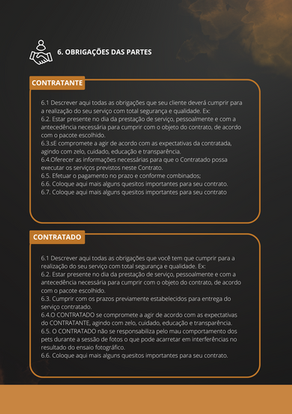 Modelos prontos com linguagem leve e profissional, estrutura clara e design aplicado. Cada contrato é direcionado para um tipo de serviço como ensaio ao ar livre, fim de vida, eventos, estúdio, marcas, e mais.